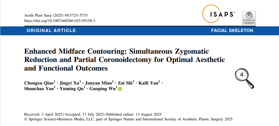 针对更为复杂的中面部轮廓重塑,颧骨降低术后可能出现的张口受限并发症,吴国平教授团队的另一项研究评估了同期进行颧骨降低术与部分冠突切除术的联合术式效果。吴国平教授为通信作者,乔宠旭医师为第一作者的论文《Enhanced Midface Contouring: Simultaneous Zygomatic Reduction and Partial Coronoidectomy for Optimal Aesthetic and Functional Outcomes》发表于《Aesthetic Plastic Surgery》2025年第49卷第20期,该研究基于术前三维CT测量(如冠突髁突指数CCI),对存在颧骨突出伴冠突过长风险的患者实施预防性冠突切除。结果显示,所有患者均成功实现中面部轮廓改善,术后6个月最大切牙间开口度恢复至术前水平,未出现持续性张口受限。同时,患者对颧骨外观的FACE-Q满意度评分从术前39.58大幅提升至术后75.04。这表明,在严格适应症把控下,联合术式能有效规避因颧骨后移可能导致的冠突-颧骨撞击,在提升美学效果的同时保障了下颌功能,实现了“形态”与“功能”的双重优化。