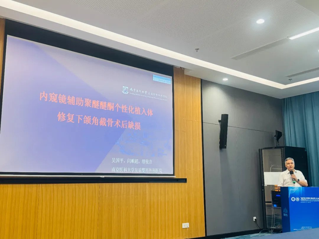 与此同时,吴国平院长作为专题主持人及发言人参与的2025中国生物材料大会,是国内生物材料领域的重要学术会议。在此跨学科的高层次平台上,吴国平院长再次报告了《内窥镜辅助聚醚醚酮个性化植入体修复下颌角截骨术后缺损》这一课题,凸显了该研究在“医工结合”领域的巨大潜力。此举不仅向材料学界展示了我院在临床应用前沿的迫切需求与创新实践,也体现了我院积极推动生物新材料在整形外科,尤其是高难度颅颌面修复领域转化应用的领先视野。